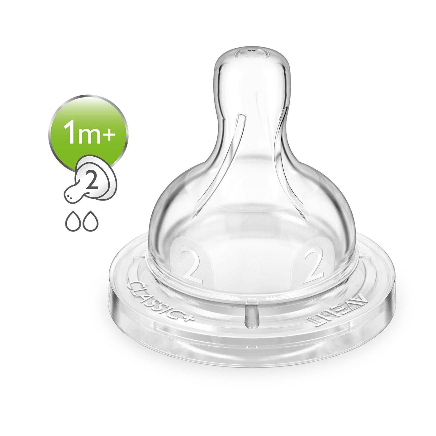 Tétine en silicone extra souple avec valve anti-colique intégrée. À utiliser uniquement avec les biberons Philips AVENT Classic.
