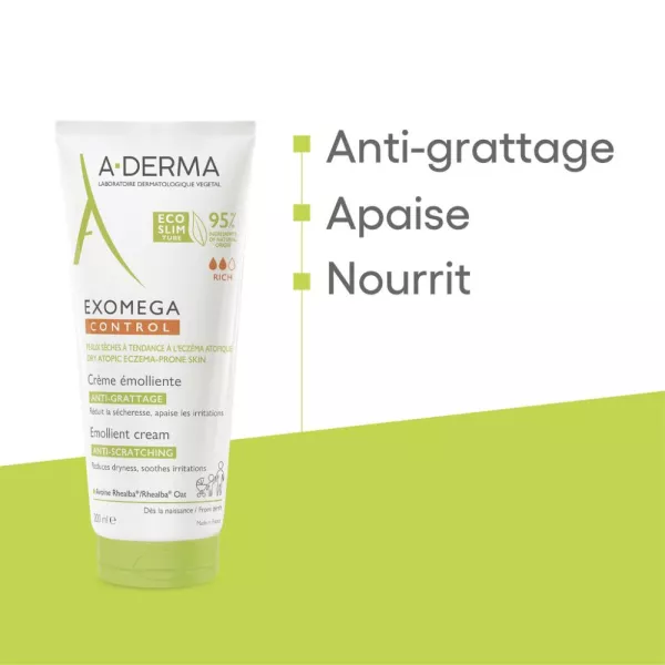 A-DERMA Exomega Control Crème Émolliente Anti-Grattage Stérile 200 ml est une crème spécialement formulée pour les peaux sèches à tendance atopique. Elle permet de contrôler les sensations d’irritation chez le nouveau-né, l’enfant ou l’adulte.