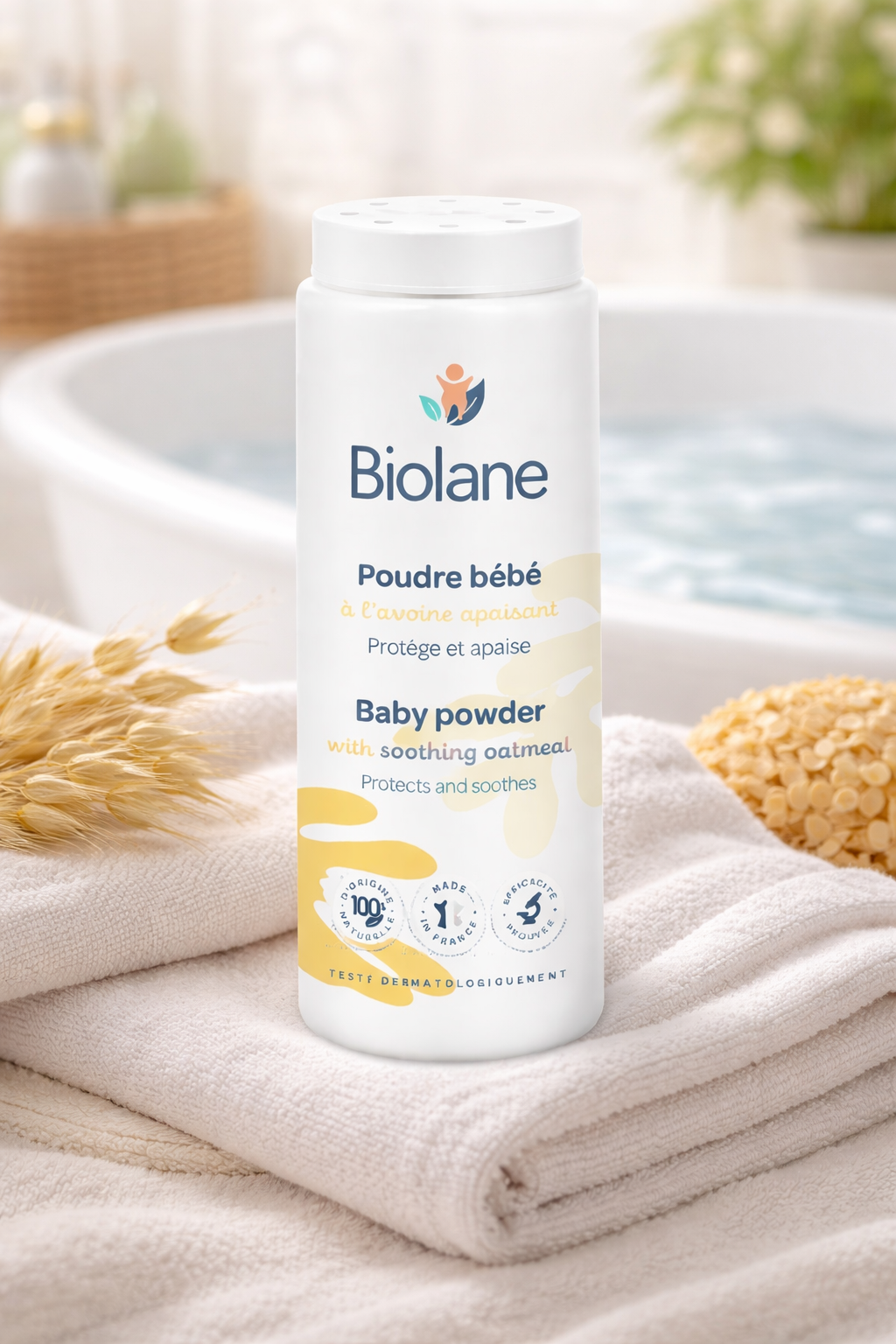BIOLANE POUDRE DE CHANGE poudre douce pour bébé qui absorbe l’humidité, apaise les rougeurs et protège la peau délicate du siège.